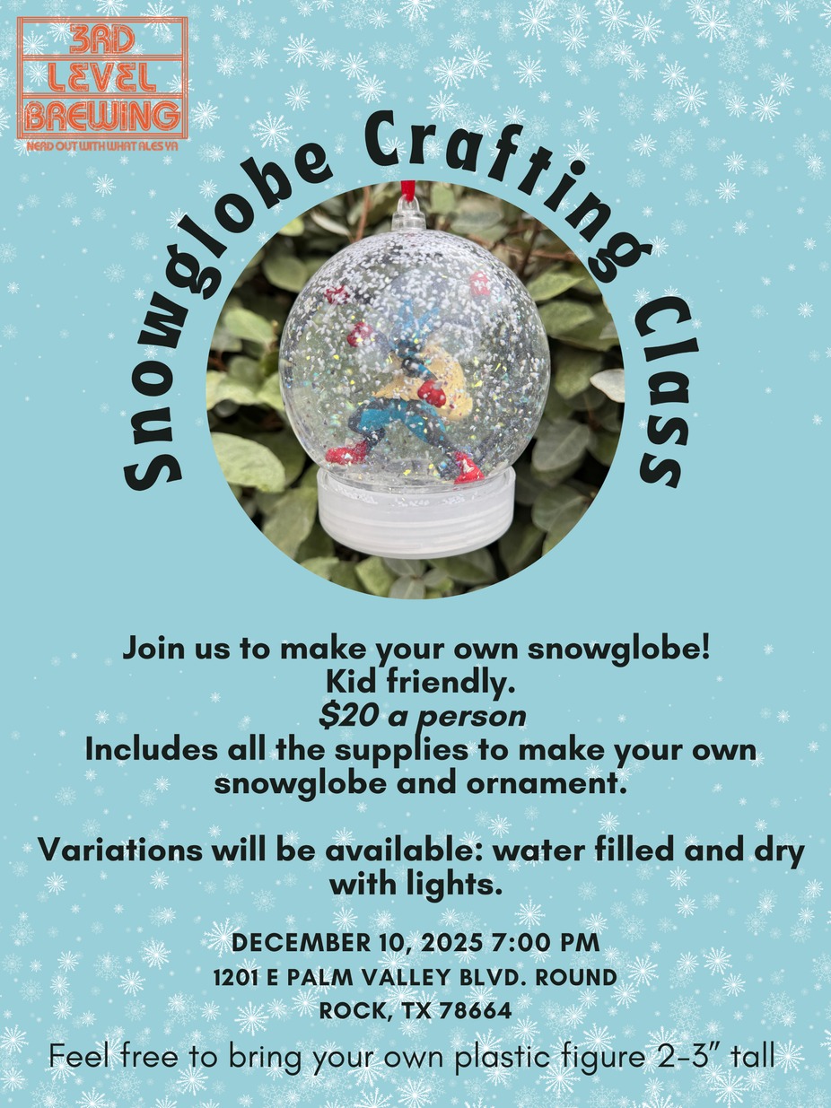 We are hosting a snowglobe crafting session on Wednesday, 12/10/2025, at 7:00 PM. All materials will be provided, but if you would like to have your own figurine in the globe, bring one that is 2-3" tall.