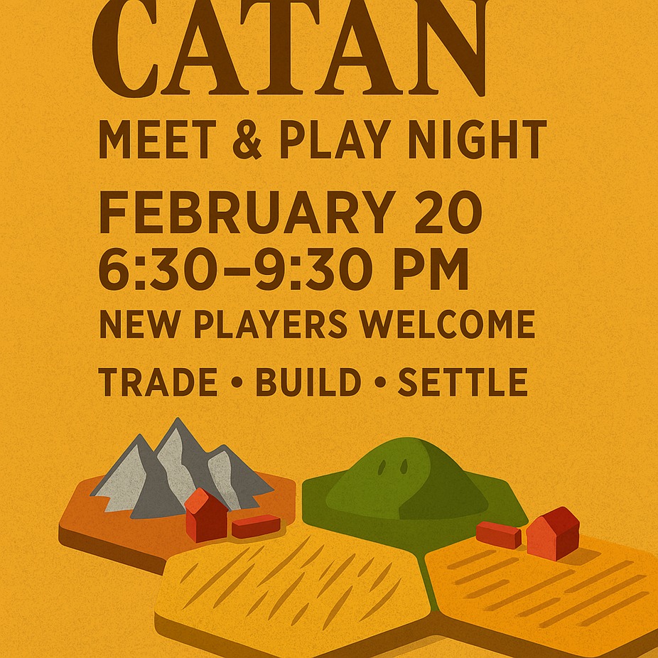 Roll the dice and compete for the island! Join us for a relaxed Settlers of Catan Meet & Play Night featuring open tables, beginner‑friendly instruction, and great beer. Play a round, swap tables, and make new friends. Free to attend.