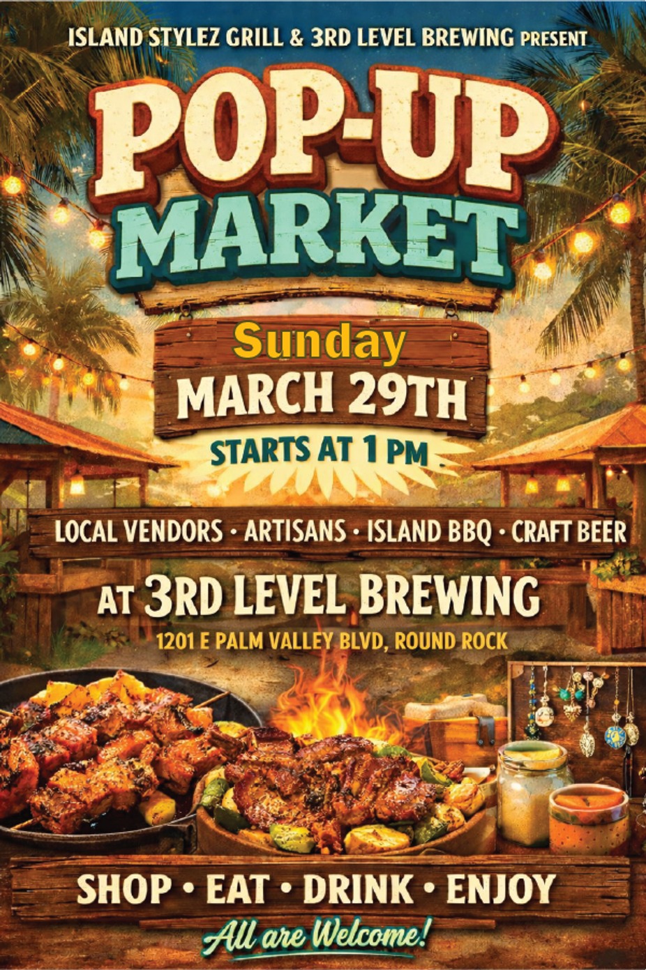 Island Stylez Grill is popping up at 3rd Level Brewing for a Pop‑Up Market on Sunday, March 29 starting at 1 PM.